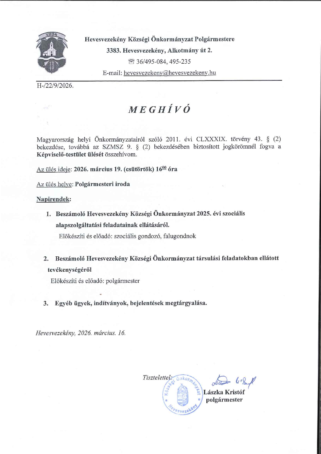 Meghívó 2026.03.19. Képviselőtestületi ülésre